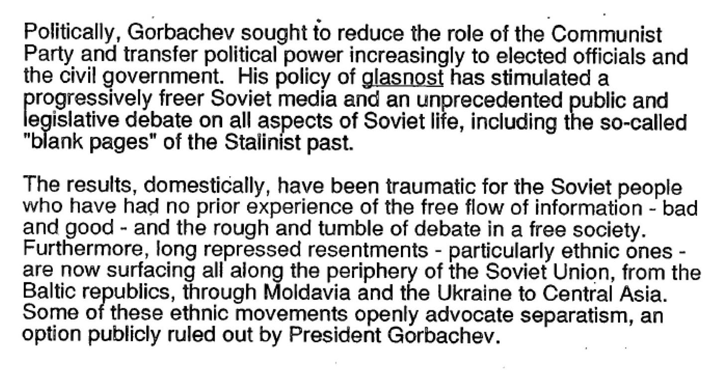 Had it brought to the surface long-repressed ethnic/national ambitions and resentments (CDMV00023)? How would Moscow handle the nationalities question, and how would Soviet policy evolve in republics like Ukraine, Armenia, and Azerbaijan?