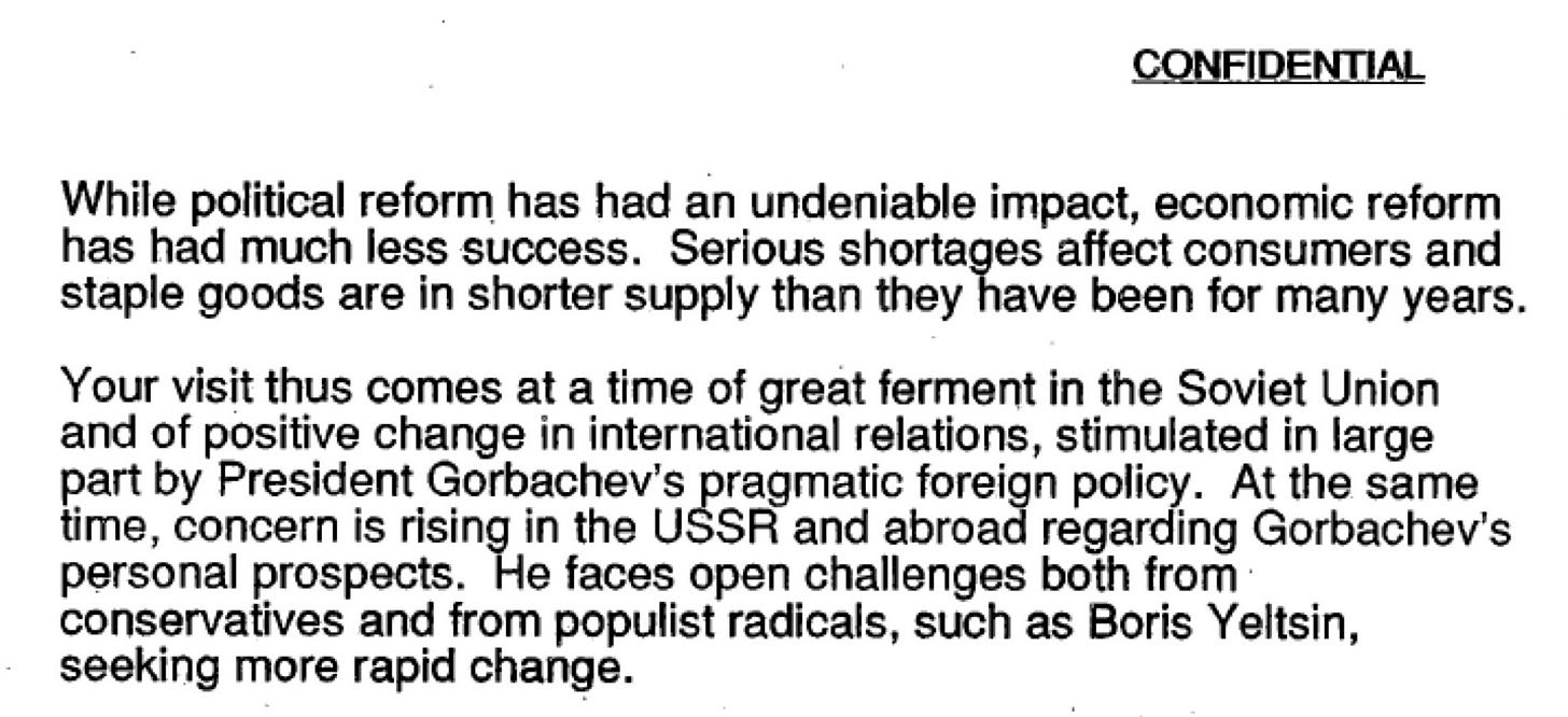 For all the bonhomie and new possibilities in relations between Arctic neighbours, the documents reveal that the visit was also an opportunity for Mulroney to raise pressing issues with his Soviet counterparts. Economic reform within the Soviet Union had stagnated. Were the Soviet people going to lose faith in perestroika? Could Gorbachev's reforms maintain the Soviet Union's "status as a superpower” if its economic and technological bases continued to erode (CDMV00020)? Glasnost seemed “traumatic” for the Soviet population.
